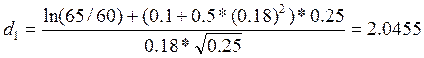 Текущая цена акции В составляет 65,00 (S). Стоимость трехмесячного опциона «колл» с ценой исполнения 60,00 (X) равна 6,20. Стандартное отклонение по акции В равно 0,18 (s). Безрисковая ставка составляет 10 % (r).