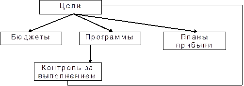 В системе долгосрочного планирования (рис. 1) цели претворяются в программы действий, бюджеты (годовой план), планы прибылей, разрабатываемые для каждого из главных подразделений предприятия. Затем программы и бюджеты выполняются этими подразделениями и определяются отклонения фактических показателей от запланированных.
