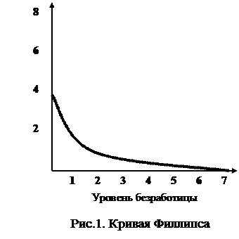 Эмпирический анализ экономической статистики Великобритании за несколько десятилетий дал возможность А.У. Филлипсу выявить закономерность между ежегодным процентом изменения номинальной заработной платы и долей безработных, где существует тесная связь. Исследуя соотношение величин безработицы и инфляции, А.У. Филлипс установил, что между уровнем безработицы и темпами роста цен существует обратно пропорциональная зависимость. Ее графическое изображение получило название кривой Филлипса (рис. 1).