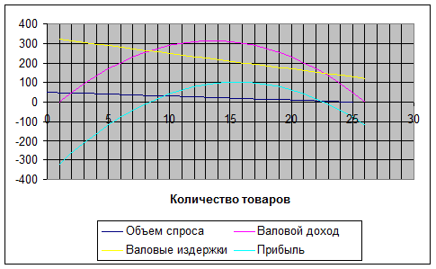 Составим таблицу зависимости цены, количества товаров, валового дохода, валовых издержек и прибыли.