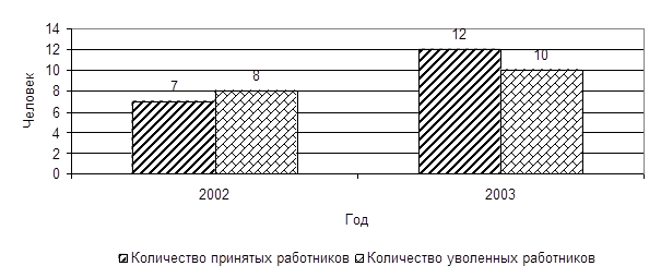 Из табл. 2.10 видно, что за анализируемый период численность персонала с высшим образованием выросла на 57,1% с 7 человек в 2002 году, до 11 человек в 2003 году. Численность человек со средним специальным образованием увеличилась на 8,7%, с 23 человек в 2002 году, до 25 человек в 2003 году. Численность персонала со средним образованием снизилась на 20% с 5 человек в 2002 году до 4 человек в 2003 году.