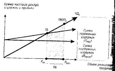 Из приведенного графика видно, что для достижения "точки безубыточности" своей операционной деятельности (ТБ) предприятие должно обеспечить такой объем реализации продукции (Ртб), при котором сумма чистого операционного дохода (валового операционного дохода за вычетом суммы налоговых платежей из него) сравняется с суммой издержек — как постоянных, так и переменных. Это условие может быть выражено следующими равенствами: