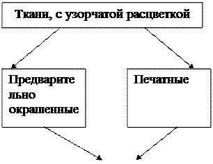 Ткани с узорчатой расцветкой могут быть получены путем их выработки из предварительно окрашенного в различные цвета волокна (меланжевые ткани), нитей (пестротканые ткани) или путем печатания в процессе отделки. Ткани с узорчатой печатной расцветкой различаются в зависимости от ряда признаков; способа нанесения рисунка (печатания, набивки), тематики, ритма, масштаба, степени стилизованности, общего колорита, признаков композиционной целостности.
