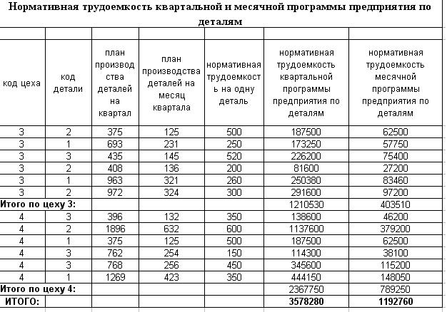 Необходимо рассчитать нормативную трудоемкость квартальной и месячной производственной программы цеха по деталям. Для этого необходимо перемножить нормативное штучно-калькуляционное время на изготовление одной детали на план производства деталей.