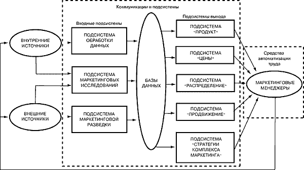 Подсистемы входа (обработки данных маркетинговых исследований и маркетинговой разведки) собирают данные из внешних и внутренних источников и вводят их в базу данных. Подсистемы выхода (продукта, цены, распределения и продвижения) обрабатывают данные, переводя их в затребованную менеджерами информацию. Подсистема "Стратегии комплекса маркетинга" помогает менеджерам разрабатывать стратегии на основе объединенного эффекта четырех элементов комплекса маркетинга.