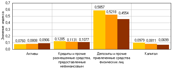 Расчет индекса Херфиндаля-Хиршмана (далее – ИХХ) свидетельствует о сравнительно низкой, если исходить из международной практики, степени концентрации активов кредитных организаций в Российской Федерации. Вместе с тем за последние два года значение индекса по банковским активам выросло почти на 20%. В случае сохранения тех же темпов уровень концентрации активов в ближайшие год-два качественно повысится.