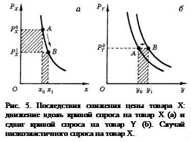 Это выразится не в движении вдоль кривой спроса на товар Y - его цена остается прежней. Изменение цены на товар Х изображается сдвигом кривой спроса на товар Y. Но в какую сторону? Если эластичность спроса на товар Х по абсолютной величине меньше единицы, то расходы потребителя на приобретение дополнительного количества товара Х меньше его выигрыша за счет снижения цены, и в целом его расходы на приобретение товара Х уменьшатся. Остальная часть его выигрыша пойдет на увеличение покупки товара Y, и кривая спроса сместится вправо. Площадь заштрихованного прямоугольника на рис. 5,б показывает дополнительные расходы на товар Y.