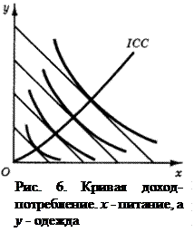 На каждом уровне дохода потребитель будет выбирать самый полезный набор благ, и можно сказать, что каждой бюджетной линии соответствует своя оптимальная точка. Если мы рассмотрим все возможные уровни дохода и соединим все точки выбора, соответствующие каждому уровню, то мы получим линию доход-потребление. По ней движется потребитель при изменении своего дохода (рис. 6).[5]