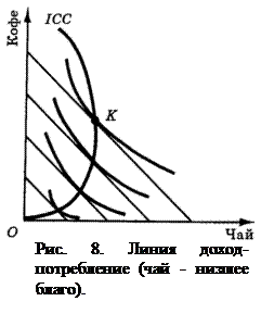 На рис. 8 представлена линия доход-потребление некоторого потребителя для случая чай-кофе. Легко заметить, что эта линия на участке выше точки К поворачивает в направлении уменьшения потребления чая (в отличие от линий доход-потребление для пищи и одежды, изображенной на рис. 7). Такой поворот линии доход-потребление на рис. 8 означает, что при уровне дохода потребителя, превышающем уровень, для которого оптимальной комбинацией кофе и чая является набор K, чай становится низшим благом.