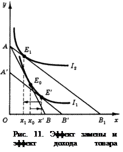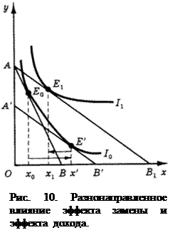 Случай разнонаправленного влияния эффекта замены и эффекта дохода. Предположим, что товар Х - низшее благо. Пусть цена на этот товар снизилась, а цены прочих товаров и доход потребителя остались неизменными. Разложение общего эффекта изменения цены на эффект замены и эффект дохода для этого случая представлено на рис. 10.