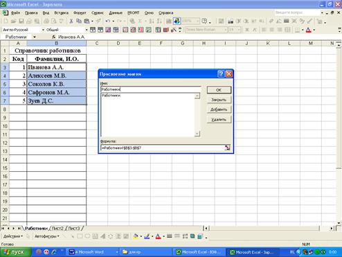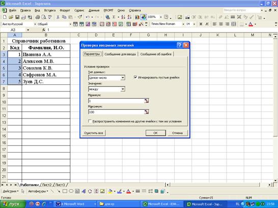 таблицу работников и вводим в нее данные. Затем выделяем графу кодов и выбираем пункт меню Данные