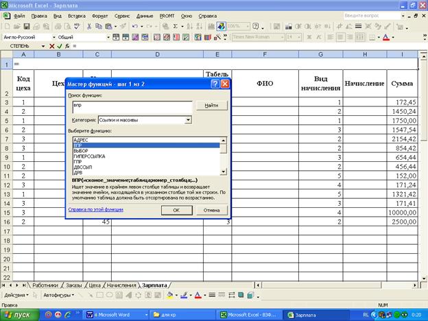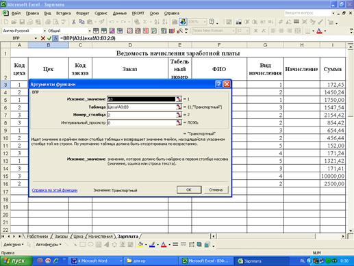 В графы Цех, Заказ, ФИО и Начисление вводим формулы для поиска наименований в соответствующих справочниках.