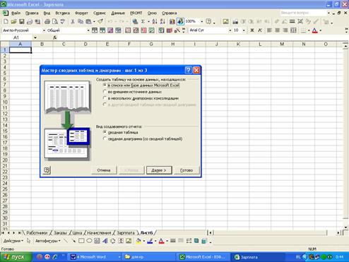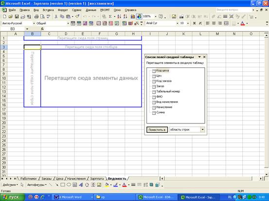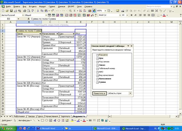 Перетаскиваем поля Заказ, Начисление, Цех в таблицу, а поле Сумма в область данных. Получим сводную таблицу, которая отображает данные в требуемом виде.