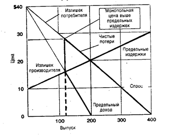 В условиях монополии производство прекращается, не достигнув точки, где цена, по которой потребитель готов купить последнюю произведенную единицу продукции, в точности равна альтернативным издержкам ее производства. Излишек потребителя меньше, а излишек производителя — больше, чем при совершенной конкуренции. Некоторые потенциальные выгоды торговли остаются нереализованными. Именно из-за этих чистых потерь монополия и считается одной из форм фиаско рынка.