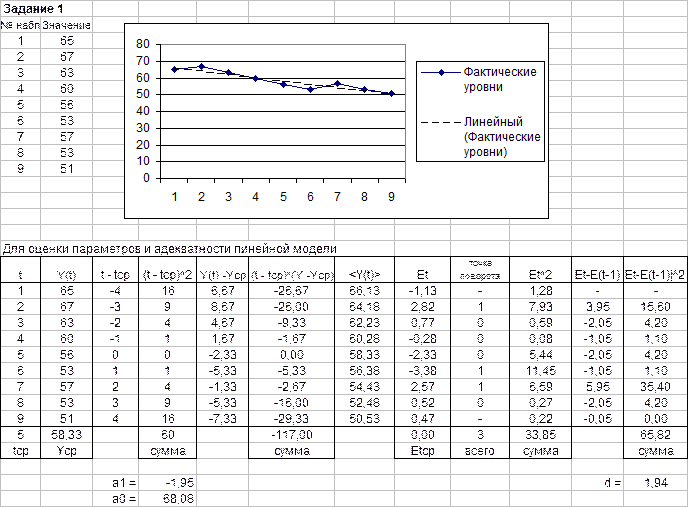 2) построить линейную модель Y(t) = a0 + a1 * t, параметры которой оценить с помощью МНК;