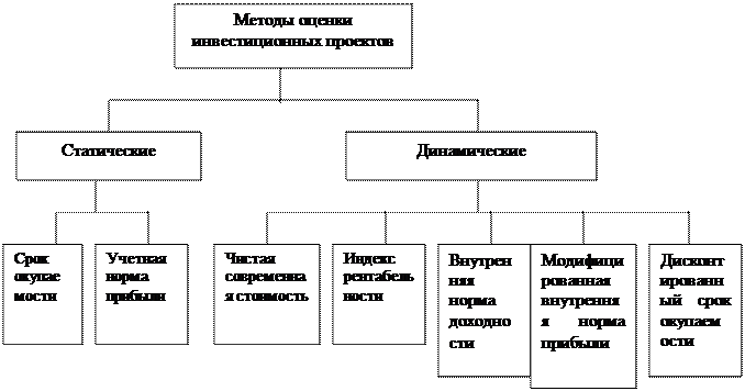 Совокупность методов, применяемых для оценки эффективности инвестиций, можно разбить на две группы: динамические (учитывающие фактор времени) и статические (учетные). (схема 1.)