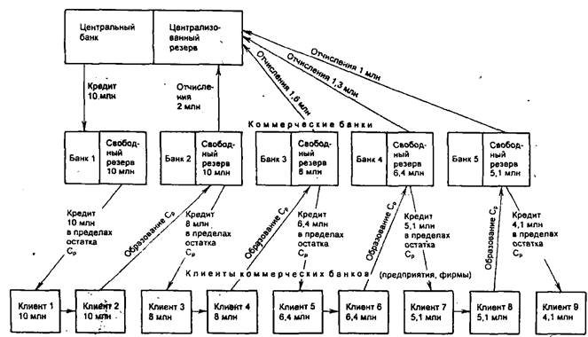 Свободный резерв коммерческого банка 4 исчезает (хотя средства на расчетном счете клиента б остаются неизрасходованными), у коммерческого банка 5 он появляется. В свою очередь этот банк часть своего свободного резерва - 1 млн руб. (20% ПР) оставляет в центральном банке в виде отчислений в централизованный резерв, а остальную часть (4,1 млн руб.) использует для выдачи ссуды клиенту 9. Далее процесс продолжается до полного исчерпания свободного резерва, который в итоге за счет отчислений в централизованный резерв аккумулируется в центральном банке и достигает размера первоначального свободного резерва (10 млн руб. в банке 1).