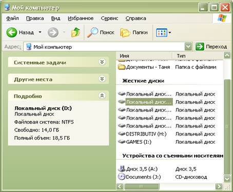 Чтобы просмотреть содержимое папки «Мой компьютер» нажмем «Пуск» и выберем пункт «Мой компьютер» или щелкнем иконку на рабочем столе. После этого откроется следующее окно: