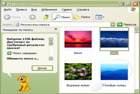 Поиск файлов осуществляться с применением средства Поиск, которое вызывается выбором из меня Пуск пункта Поиск. В котором нужно либо указать имя искомого файла целиком, либо использовать символы * и ?. Для поиска графических файлов разных типов зададим *.gif. *.jpg, *.tif.