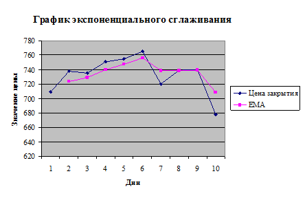 Даны цены за 10 дней. Интервал сглаживания принять равным пяти дням. Рассчитать: