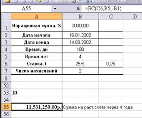 4. В кредитном договоре на сумму 2 000 000 руб. и сроком на 4 года, зафиксирована ставка сложных процентов, равная 25% годовых. Определить наращенную сумму.