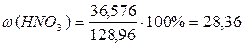 В общей массе полученного раствора (10,56 + 118,4 = 128,96 г) содержание HNO3 составляет 1,056 + 35,52 = 36,576 г. Отсюда процентная концентрация полученного раствора равна: