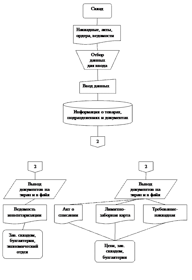 Технологический процесс функционирования системы, представленный в виде схемы, показывает решение комплекса задач оператора материального склада в автоматизированной системе, взаимосвзяь совокупности входных и выходных документов и лиц, от которых и к которым поступает обрабатываемая информация.