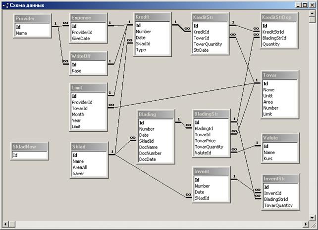 На следующем рисунке представлена схема взаимодейтствия таблиц базы данных системыная модель системы, которая показывает как они связаны, а также какая это связь (один к одному или же один ко многим).