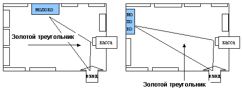 Если проследить путь покупателя в небольшом торговом зале, то можно отметить существование так называемого "золотого треугольника" – площади, расположенной между входной дверью, кассой и самым ходовым товаром в магазине. Ходовой товар в зависимости от специфики магазина может быть разным. Это может быть стеллаж с газетами или сигаретами, холодильник с напитками, секции молочных или хлебобулочных изделий. Товар, интересующий большинство покупателей, должен быть расположен внутри так называемого "золотого треугольника".