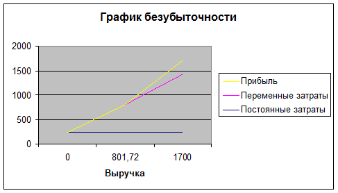 Из графика видно, что порог рентабельности фирмы, т.е. момент, после которого фирма начинает получать прибыль, составляет 801 тыс. руб.