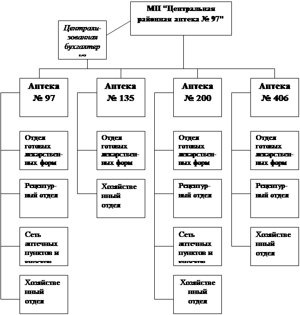 В состав МП ЦРА № 97 входят три аптеки I категории, одна аптека II категории, восемь аптечных пунктов I категории, пять аптечных киосков и централизованная бухгалтерия. Структура предприятия представлена на рис.1.