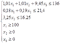 Продукцией городского молочного завода являются молоко, кефир и сметана. На производство 1 т. Молока, кефира и сметаны требуется соответственно 1,01; 1,01 и 9,45 т. Молока. При этом затраты рабочего времени при разливе 1т. Молока и кефира составляют 0,18 и 0,19 машиночаса. На расфасовке 1 т. Сметаны заняты специальные автоматы в течении 3,25 ч. Всего для производства цельномолочной продукции завод может использовать 136 т. Молока. Основное оборудование может быть занято в течении 21,4 машиночасов, а автоматы по расфасовке сметаны – в течении 16,25 ч. Прибыль от реализации 1 т. Молока, кефира и сметаны соответственно равна 30,22 и 136 руб. Завод должен ежедневно производить не менее 100 т. молока.