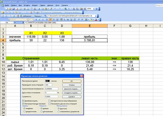 В режиме параметры окна диалога «Поиск решения» мы определяем тип задачи – линейная (Рис.2.).