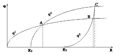 При R1 закупки примерно в одинаковой пропорции. До R2 – некоторое предпочтение q1. Начиная с R2 потребитель практически перестает потреблять q2, т.е. происходит насыщение товаром q2.
