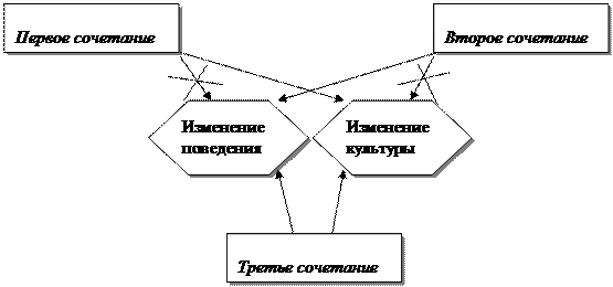 Третье сочетание — изменения происходят и в области поведения, и в области культуры. Это ситуация постоянных изменений в том смысле, что люди по-настоящему и искренне ценят то, что они по-новому делают свою работу. Устойчивость изменений в этом случае обеспечивается тем, что обе стороны (поведение и культура) взаимно усиливают и поддерживают друг друга. Это, в свою очередь, усиливает внутреннее удовлетворение в силу того, что люди действительно все больше верят в изменения и ценят их, меняя свое поведение и дальше. Графически все возможные сочетания можно представить следующим образом: