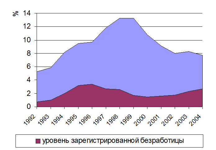 Изменения, происходящие в экономике и сфере занятости населения, отразились и на динамике регистрируемой безработицы: среднегодовая численность безработных, зарегистрированных в органах службы занятости населения в течение 2004 года, уменьшилась по сравнению с 2003 годом на 2,1 тыс. чел., или 9%, и составила 21,8 тыс. чел. (2,6% экономически активного населения); численность безработных и уровень регистрируемой безработицы имели высокую помесячную амплитуду колебаний, и на конец декабря составили, соответственно, 30,5 тыс. чел. и 3,7% экономически активного населения.