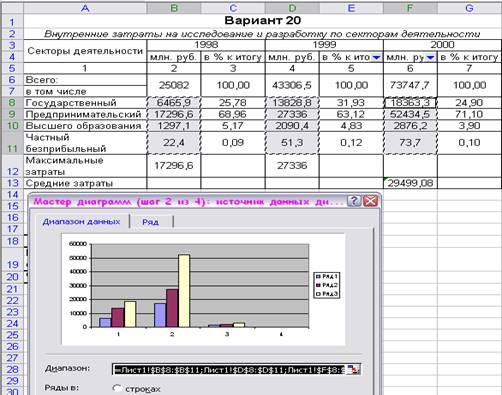 В ячейки А7 – А12 введем следующие названия секторов деятельности: Государственный, Предпринимательский, Высшего образования и Частный бесприбыльный, а также Максимальные затраты и Средние затраты.
