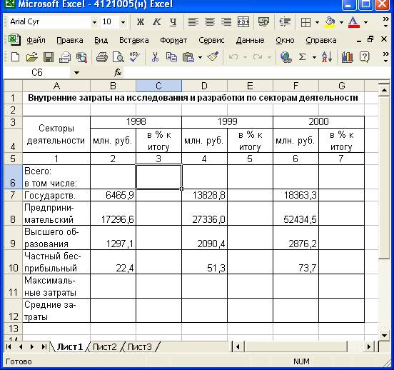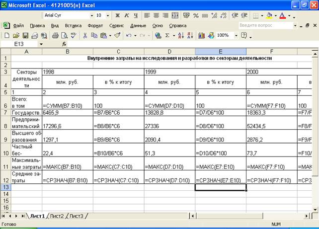 В ячейки А7 – А12 введем следующие названия секторов деятельности: Государственный, Предпринимательский, Высшего образования и Частный бесприбыльный, а также Максимальные затраты и Средние затраты.