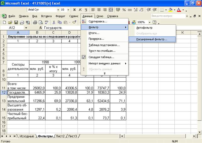 В результате применения фильтра получим данные о секторе, в котором затраты на исследование составили в 2000 г. от 1,5% до 20%: