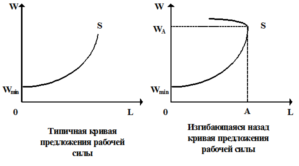 Типичной кривой предложения является восходящая линия, что связано с необходимостью отвлечения нанимаемого работника от других видов деятельности путем выплаты более высокой зарплаты. Но существуют и изгибающиеся назад кривые предложения труда (обратные кривые предложения труда). На них отражается альтернатива - досуг, который выбирают наемные работники при достаточно высоком уровне оплаты труда.