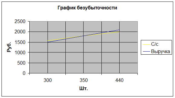 Как видно на графике точка безубыточности достигается при объёме выпуска 350 шт.