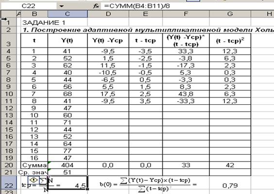 1) Построить адаптивную мультипликативную модель Хольта-Уинтерса с учетом сезонного фактора, приняв параметры сглаживания α1 =0,3; α2=0,6; α3=0,3.