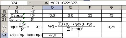 Уравнение с учетом найденных коэффициентов имеет вид: Yp = 49,6 + 0,4*t. Из этого уравнения находим расчетные значения Yp(t) и сопоставляем их с фактическими значениями: