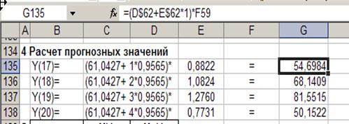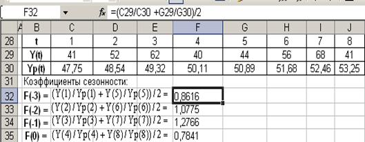Такое сопоставление позволяет оценить приближенные значения коэффициентов сезонности кварталов F(-3), F(-2), F(-1) и F(0) Эти значения необходимы для расчета коэффициентов сезонности первого года F(1), F(2), F(3), F(4) и других параметров модели Хольта –Уинтерса.