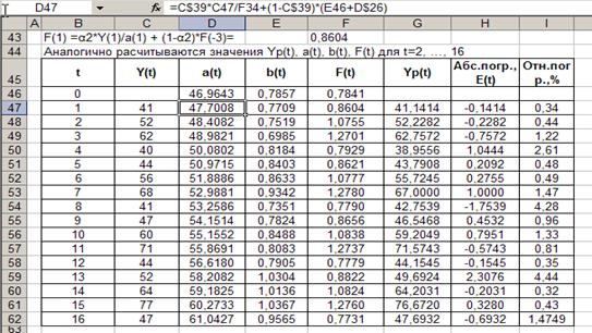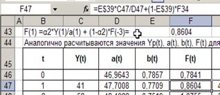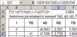 Рассчитаем значения Yp(t), a(t), b(t), F(T) для t=1 значения параметров сглаживания α1=0,3, α2=0,6, α3=0,3.