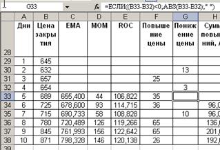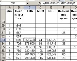 ЕМА5 = (С1+С2+С3+С4+С5)/n, в ячейку С33 введем формулу: ==СУММ(B29:B33)/5.