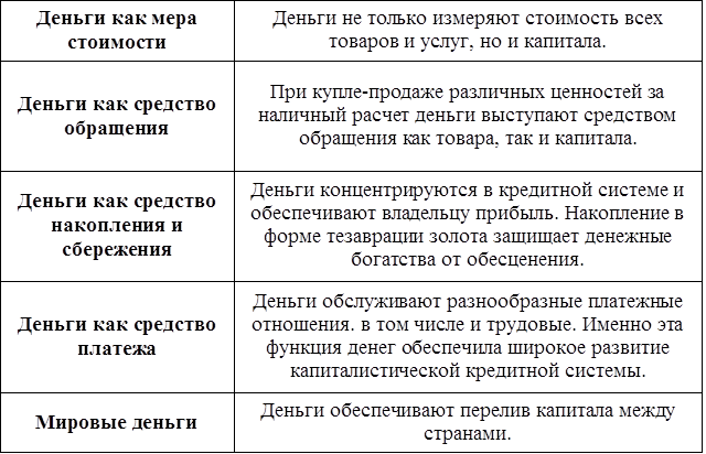 Качественно новая роль денег (в отличии от денег простого товарного производства) состоит в том, что они превращаются в денежный капитал или самовозрастающую стоимость. Такая роль денег прослеживается через рассмотренные пять функций денег (таблица).