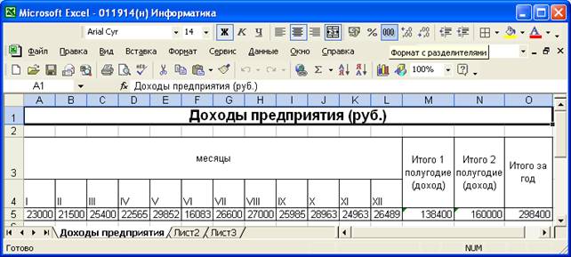 В образованное и отформатированное объединение ячеек введем текст «Доходы предприятия (руб.)».
