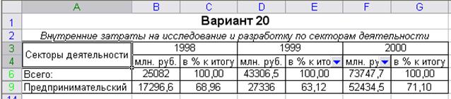 Теперь стало видно, что список секторов деятельности с затратами на исследования в 1999 году, превышающими 50% от итоговых, состоит только из одной позиции – предпринимательский сектор.