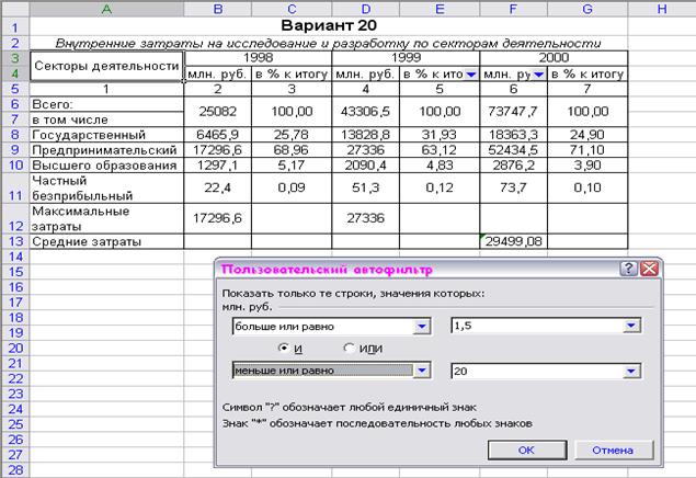 Чтобы составить список секторов деятельности с затратами на исследование в 2000 году, в размерах от 1,5 до 20 млн. руб. выполняем следующие действия: